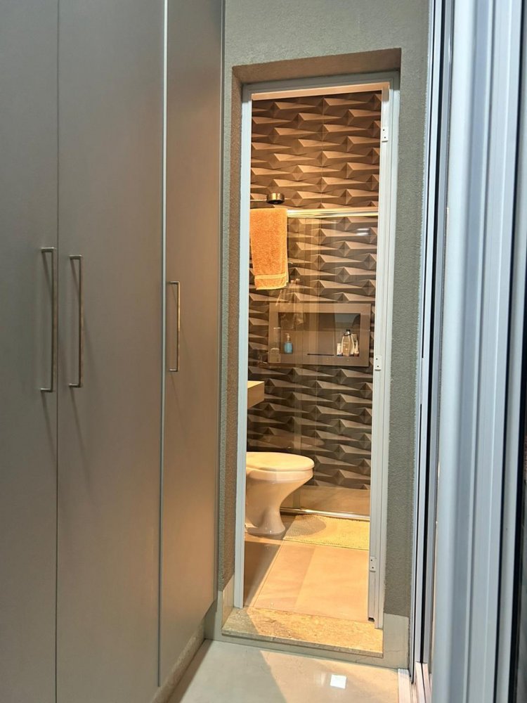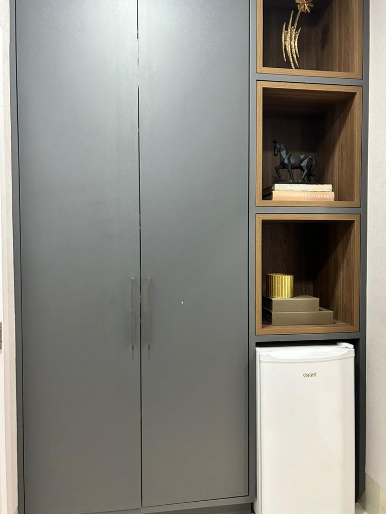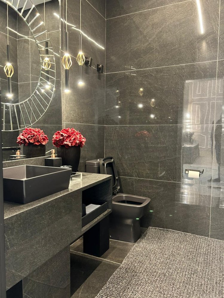- Espaço Gourmet integrado com ilha e churrasqueira revestida em pedra;