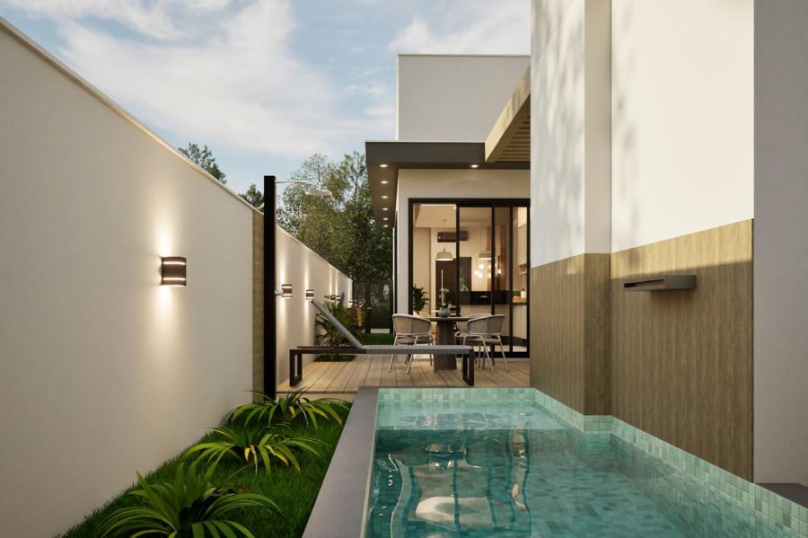 - Piscina revestida em pastilha de acabamento tipo pedra Hijau;